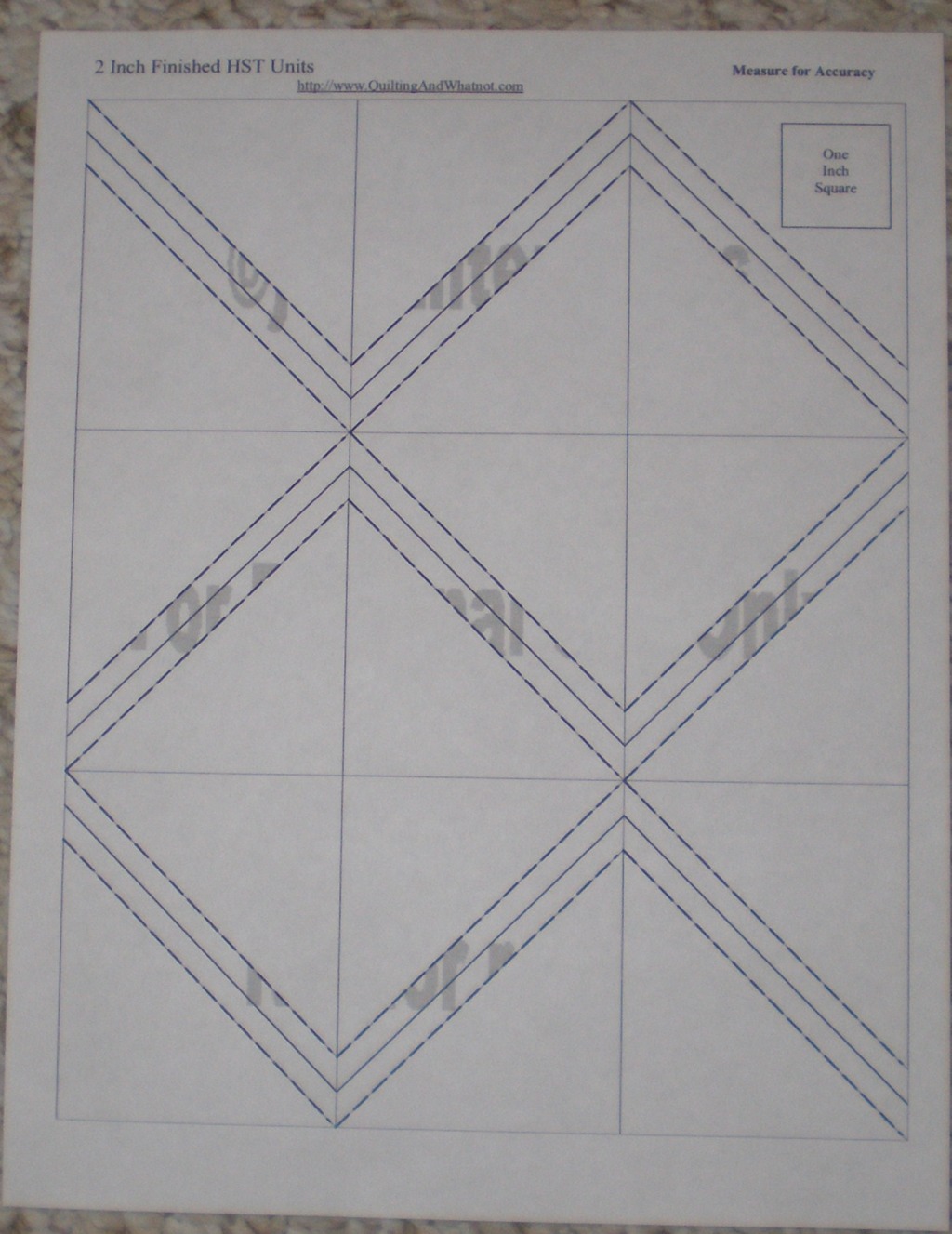 The dotted lines are the outside lines of the zig zag. The cutting lines are all the straight lines: outside borders, criss-cross, and the middle lines of the zig zags. This will produce 18 folded triangles, each with one paper triangle sewn to it. Press the triangles open and remove the paper, and there is the two-triangle square.